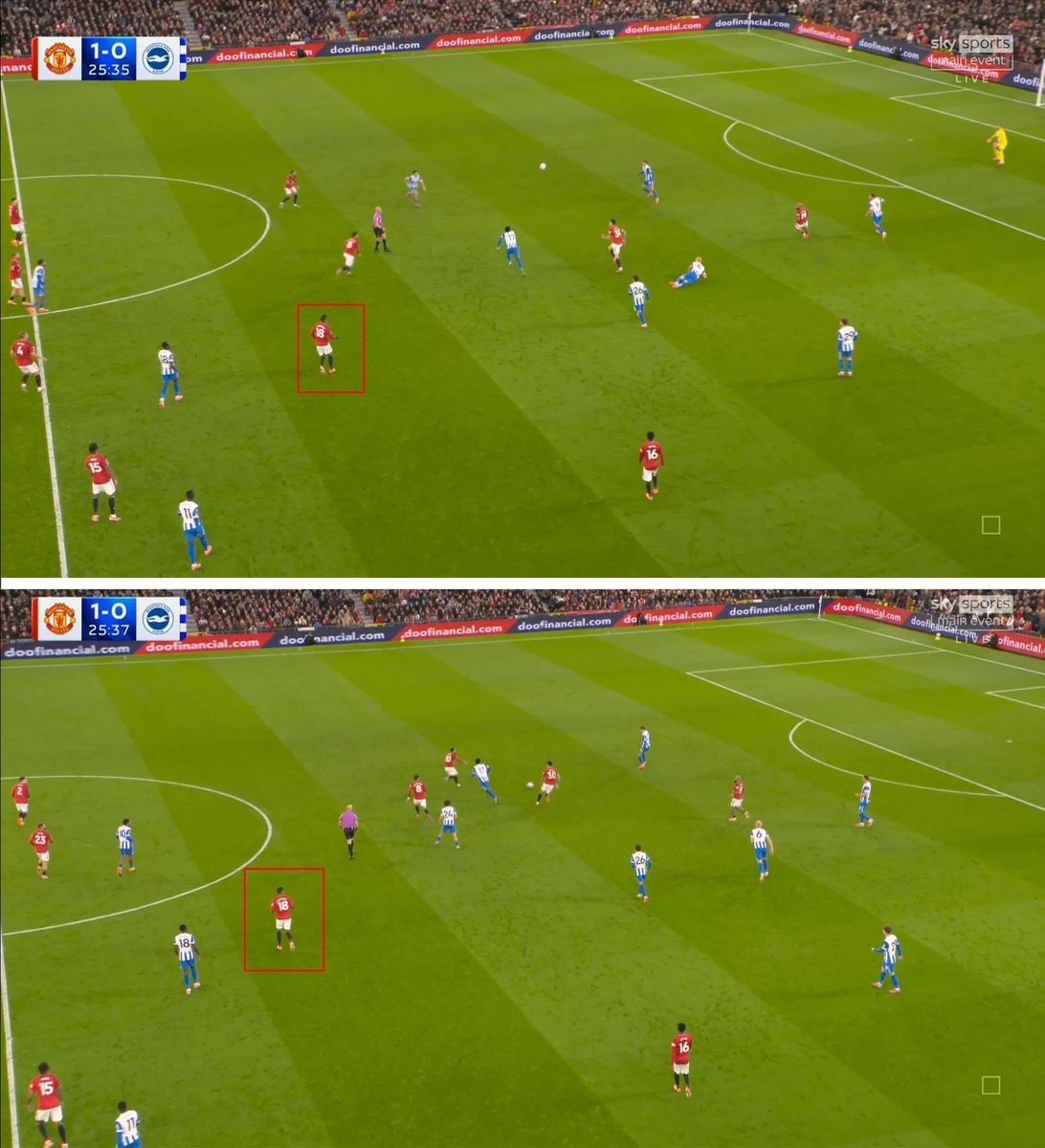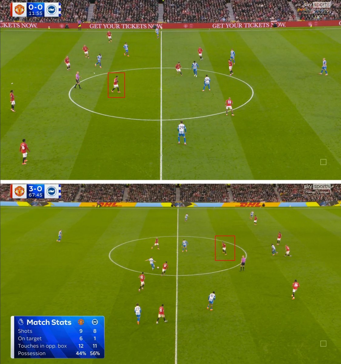 From the opening whistle against Brighton, Casemiro dictated the tempo and orchestrated United’s midfield, involving himself in nearly every attacking and defensive sequence. His individual dominance produced two decisive first-half moments: